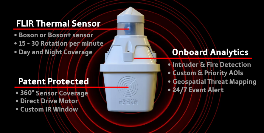 Thermal Radar este o soluție de supraveghere și detecție termică IP care asigură o supraveghere permanentă a zonei intr-un un câmp vizual complet de 360°. Prin rotirea rapidă a unui senzor termic FLIR Boson alaturi de analiza video, Thermal Radar poate fi utilizat ca sistem de detecție independent sau ca element central a strategiei de securitate fizică. Thermal Radar se integrează cu platformele VMS și PSIM prin afișarea întregii zone de detecție 360°, a hărții geospațiale și a alertelor la evenimente.